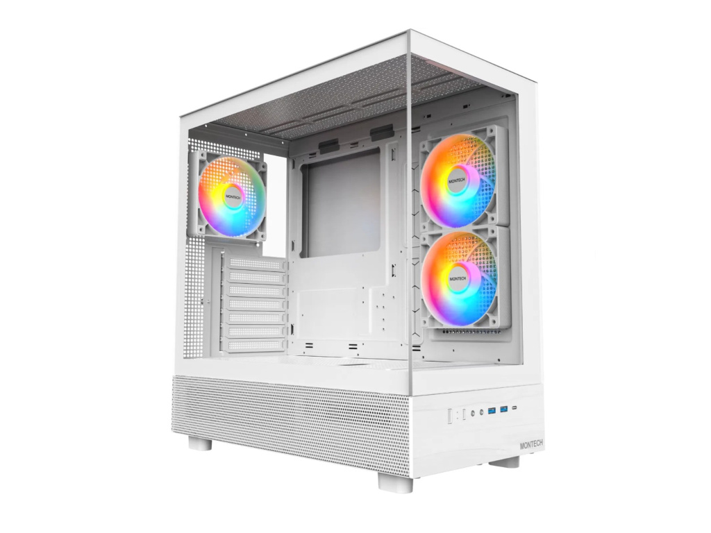 - Montech X3 - základní kvalitní skříň s vynikajícím poměrem cena/výkon obsahující 6 RGB ventilátorů, podsvícení jde zapnout či vypnout tlačítkem na PC skříni. Rychlost ventilátorů nejde regulovat (nastaveno z výroby na ideální provoz pro perfektní ventilaci), u RGB duhová barva nelze měnit. Skříň má jednoduše otevíratelný prosklený bok na pantech. Skříň obsahuje shora 2x USB 2.0 a 1x USB 3.0 a jack vstupy pro mikrofon a sluchátka. Rozměry 21 cm šířka, 48 cm výška, 37 cm hloubka. K dispozici v černé i bílé barvě.